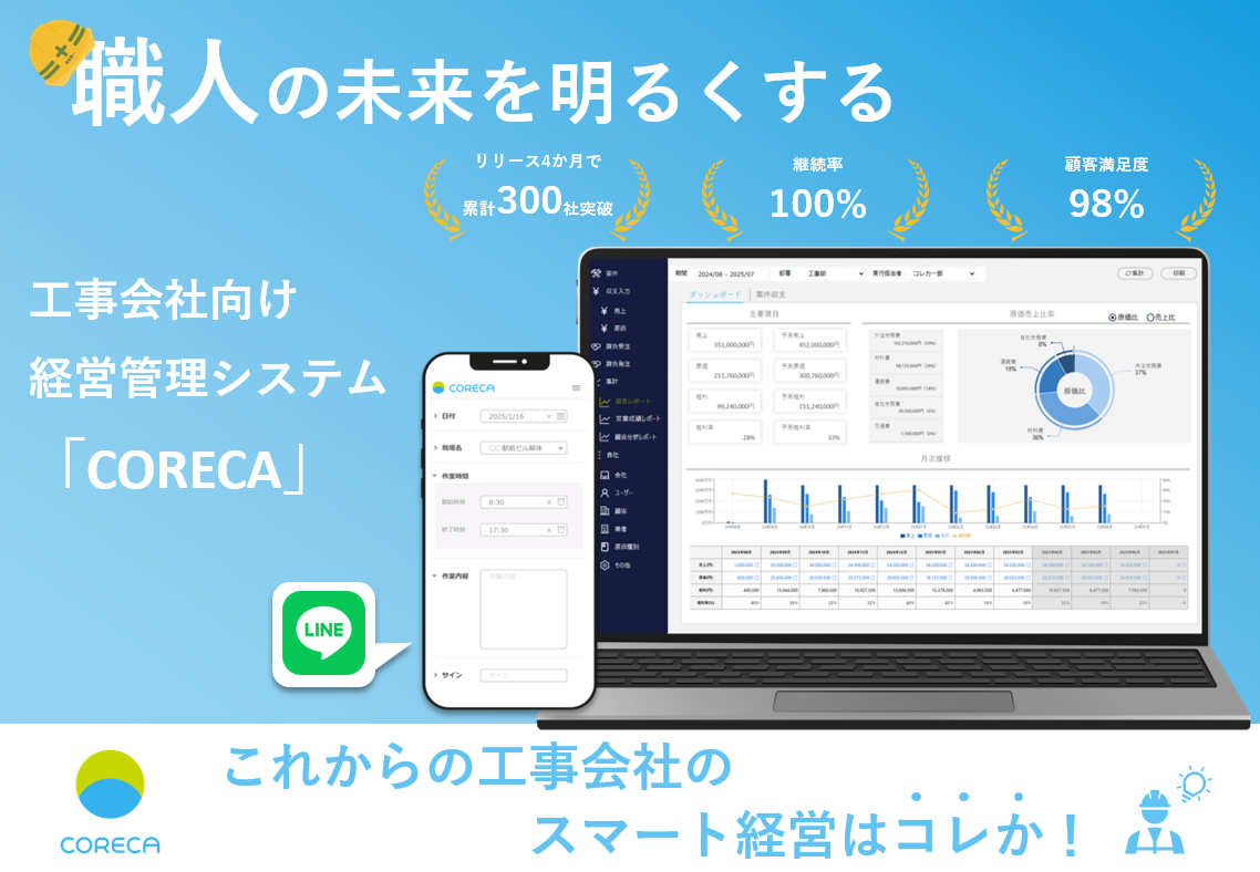 「CORECA」は、建設業に特化した経営管理クラウドであり、「工事予算に原価が収まらない」、「業務煩雑で収支管理まで手が回らない」、 「利益改善できず管理コストをかけられない」といった工事会社の課題を解決するサービスです。現在、500社以上が導入しており、顧客満足度も98%と非常に高い水準を維持しています。